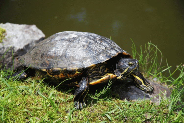 わたしは池の周りをウォ-キング、カメは池のほとりを散歩。
