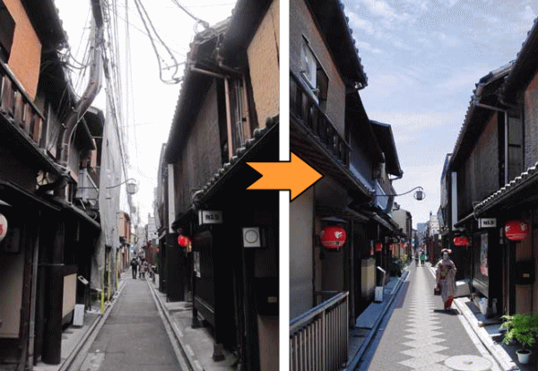 他には、京都の祇園、産寧坂(三年坂)、花見小路通、東山花街、南禅寺周辺、嵐山・清水寺周辺、渡月橋北側や清水寺の参道も地中化された。